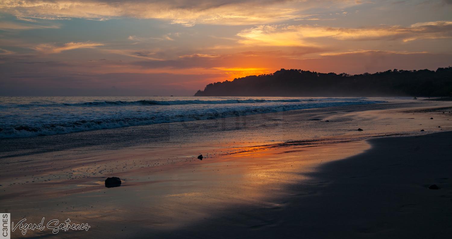 - beach Central America Costa Rica evening Manuel Antonio orange Pacific Ocean reflection sand sea sunset wet
