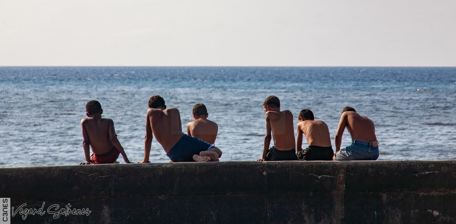 - 6 boys backs boys Cuba Habana Vieja Havanna late afternoon low sun Malecón Old Havana people sitting wall young boys