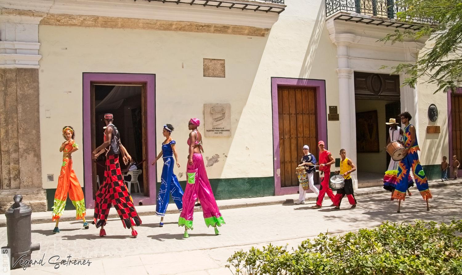 - artists colourful Cuba doorway drums Habana Vieja Havanna Old Havana people spectacle stilts street walking