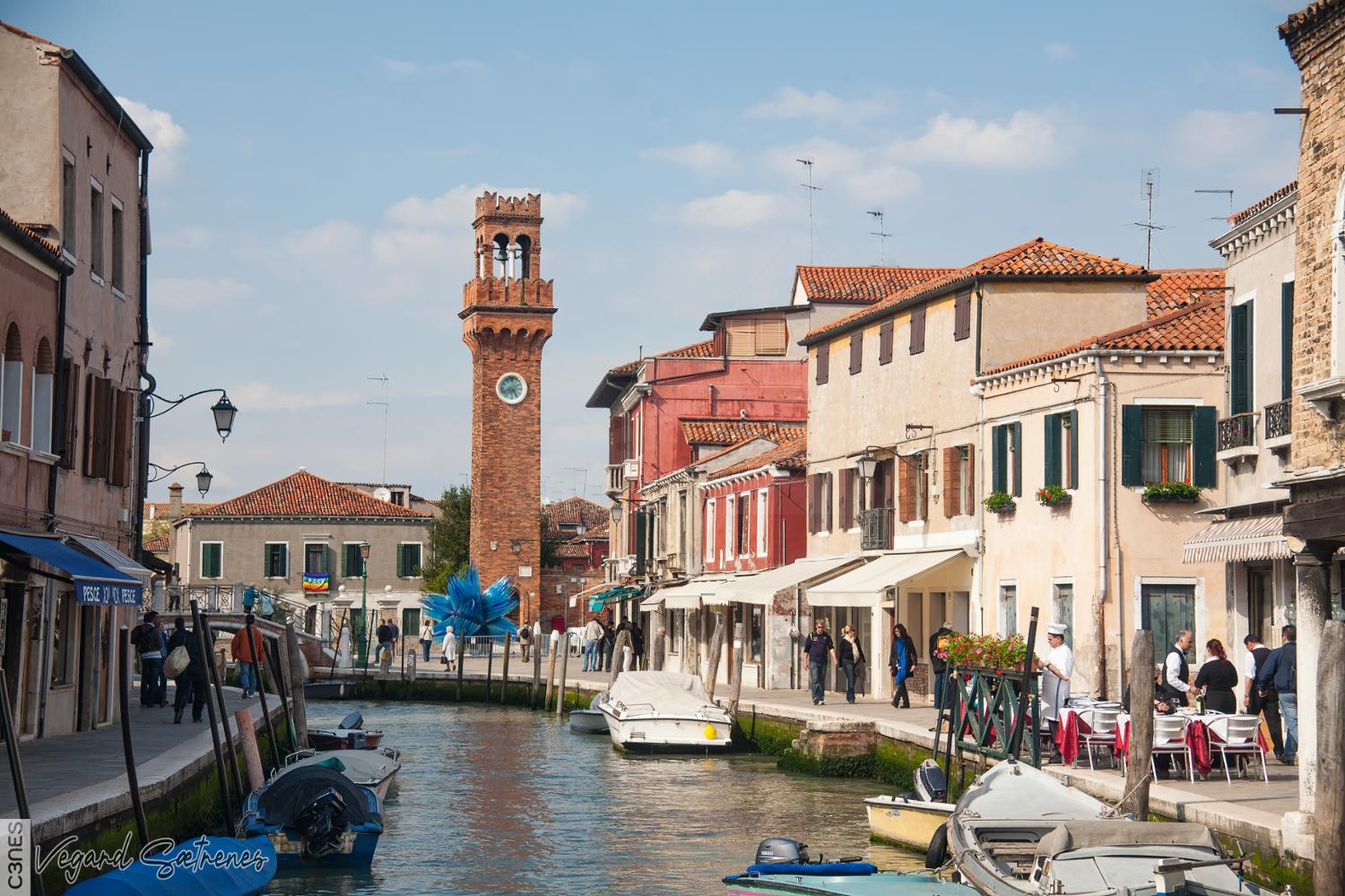 - Antonio Colleoni bell tower boat bricks buildings Campo Santo Stefano canal canal intersection chef clocktower clouds flowers Fondamenta dei Vetrai Fondamenta Manin glass glass art intersection Italy lamp moored moored boats Murano pace peace flag people piles poles restaurant roof tiles sculpture sunny day tables Torre dell'Orologio di Murano tourists Venezia Venice waiter window wooden boat