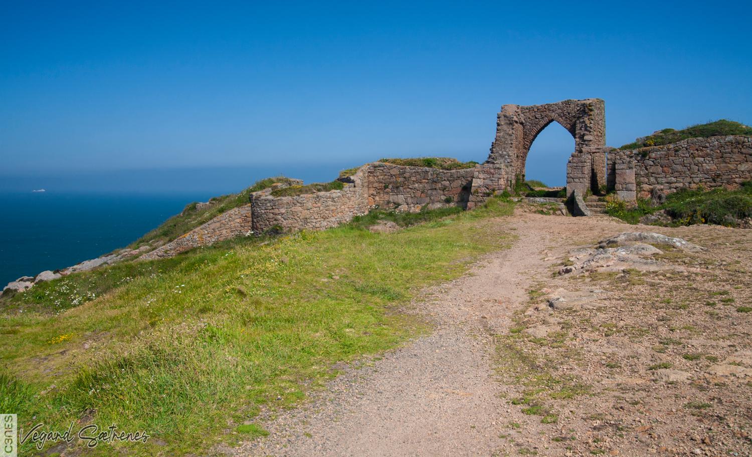 - 14th-century castle arch arched doorway blue sky brick wall Channel Islands flowers grass green green grass Grosnez Grosnez Castle Jersey path ruin Saint Ouen sea