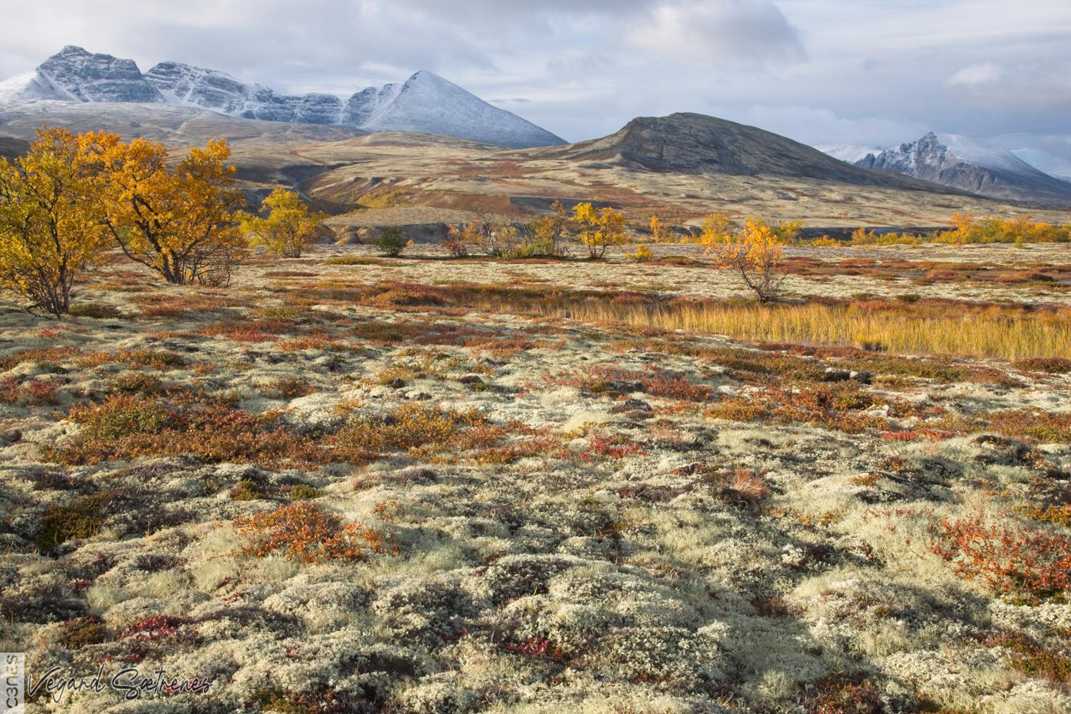 - autumn autumn colors clouds fall heather lichen moss mountain mountain birch mountain peeks National Park Norway orange red Rondane snow covered mountains yellow