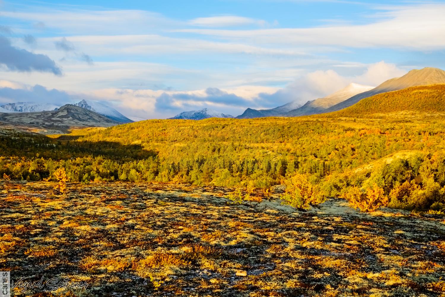 - autumn autumn colors clouds fall heather landscape lichen moss mountain mountain birch mountain peeks National Park Norway orange outdoor red Rondane scenic snow covered mountains yellow
