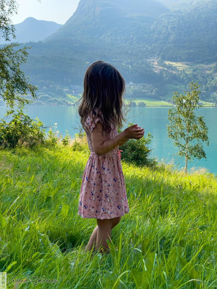 - child dark hair dress field girl grass green lake long hair meadow mountain Norway Oppstrynsvatnet pattern pink dress Sogn og Fjordane Stryn summer Tree vertical