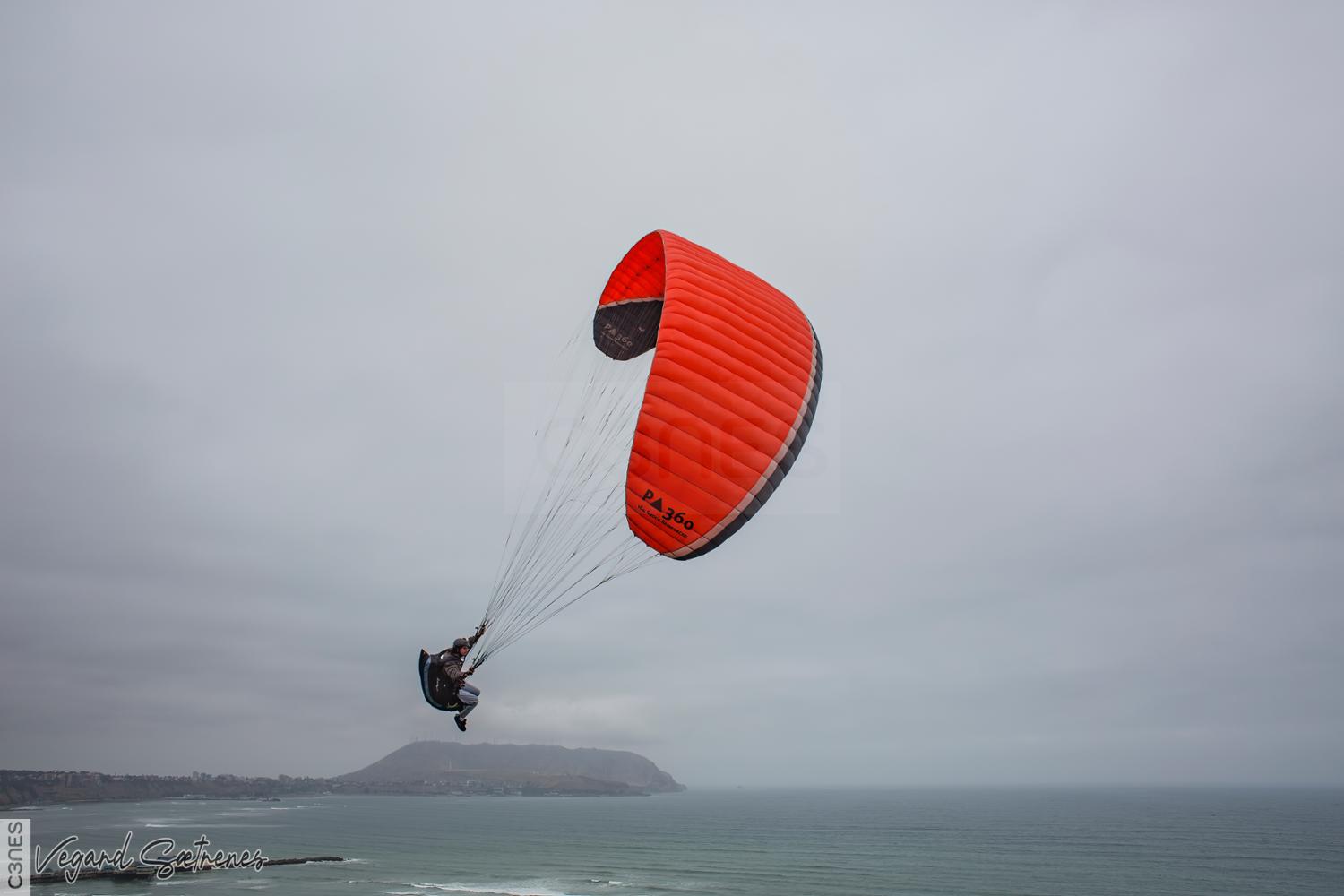 - activity adventurous air altitude arch bright color clouds coastline flying hobby Lima Miraflores ocean one overcast Pacific Ocean paraglider people Peru red sea sky South Pacific Ocean sport strings wind